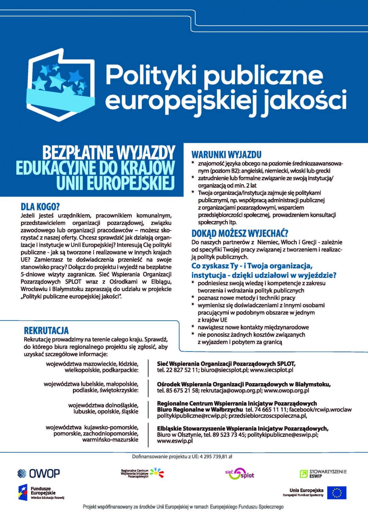 Elbląskie Stowarzyszenie Wspierania Inicjatyw Pozarządowych (Elbląg) wraz z Siecią Wspierania Organizacji Pozarządowych SPLOT (Warszawa), Regionalnym Centrum Wspierania Inicjatyw Pozarządowych (Wrocław), Ośrodkiem Wspierania Organizacji Pozarządowych (Białystok) oraz partnerami zagranicznymi: European Youth4Media Network e.V. (Niemcy), Consorzio Solidarieta Oscar Romero (Włochy), Associazione YEPP Italia (Włochy), Media TerraNea (Grecja) realizują projekt pn. „Polityki publiczne europejskiej jakości”.