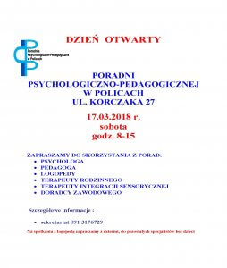 Dnia 17.03.2018 r. w godzinach od 8:00 do 15:00 w Poradni Psychologiczno-Pedagogicznej w Policach przy ul. Korczaka 27 organizowany jest Dzień Otwarty.