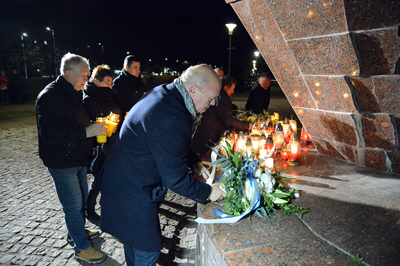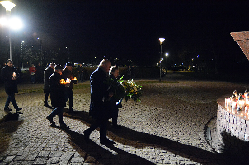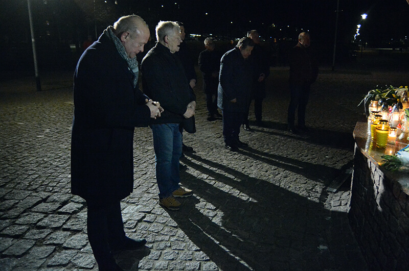 Przedstawiciele Powiatu Polickiego i Gminy Police składają kwiaty pod pomnikiem św. Jana Pawła II w Policach
