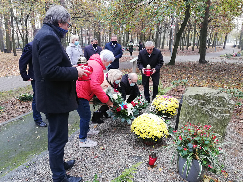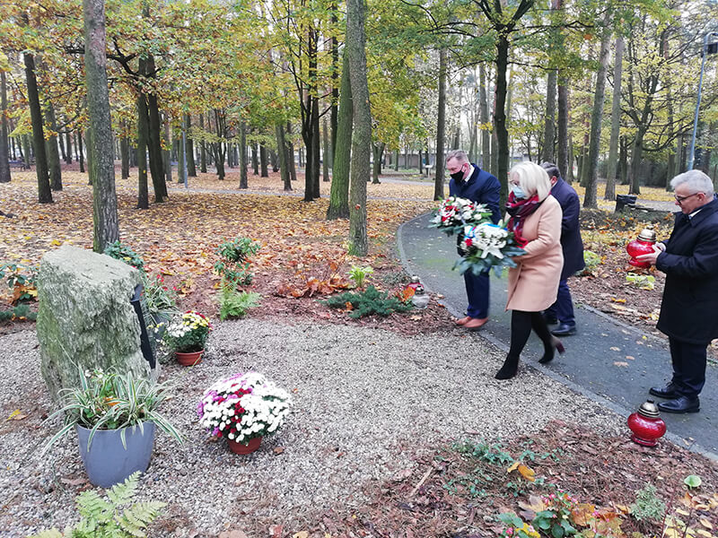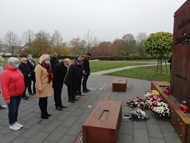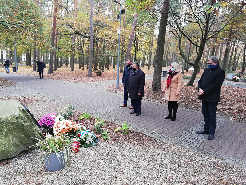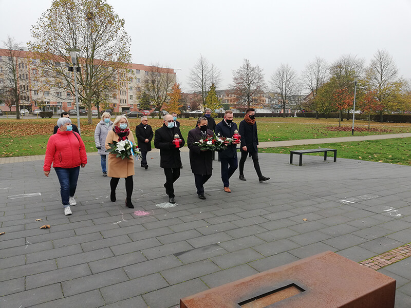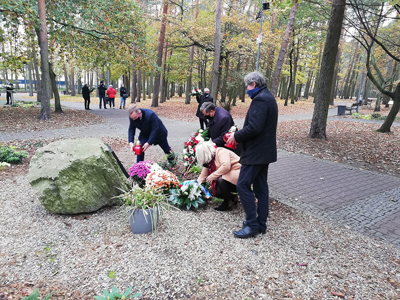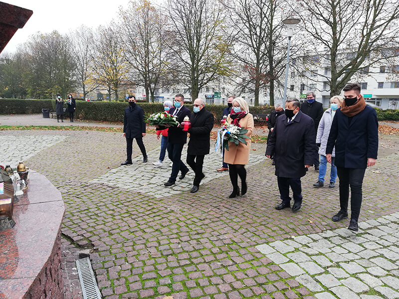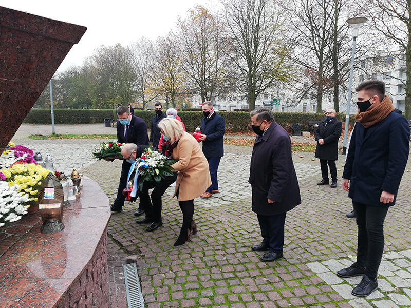 Delegacja władz samorządowych składa kwiaty pod obeliskiem pamięci w Parku Solidarności w Policach