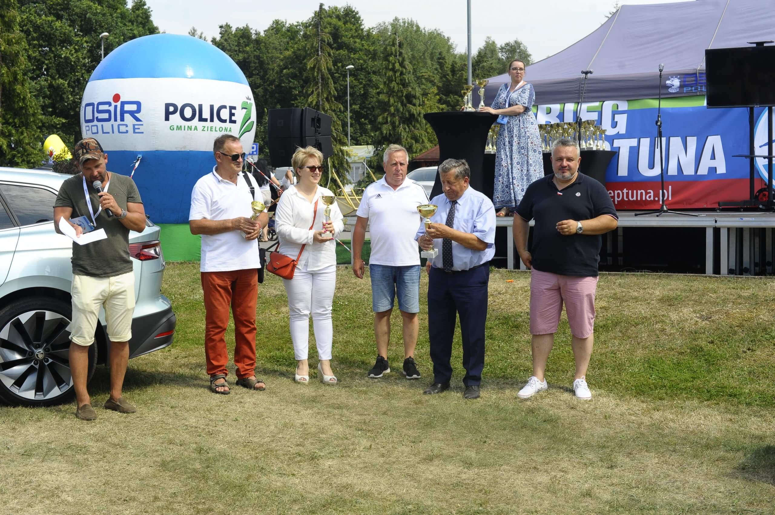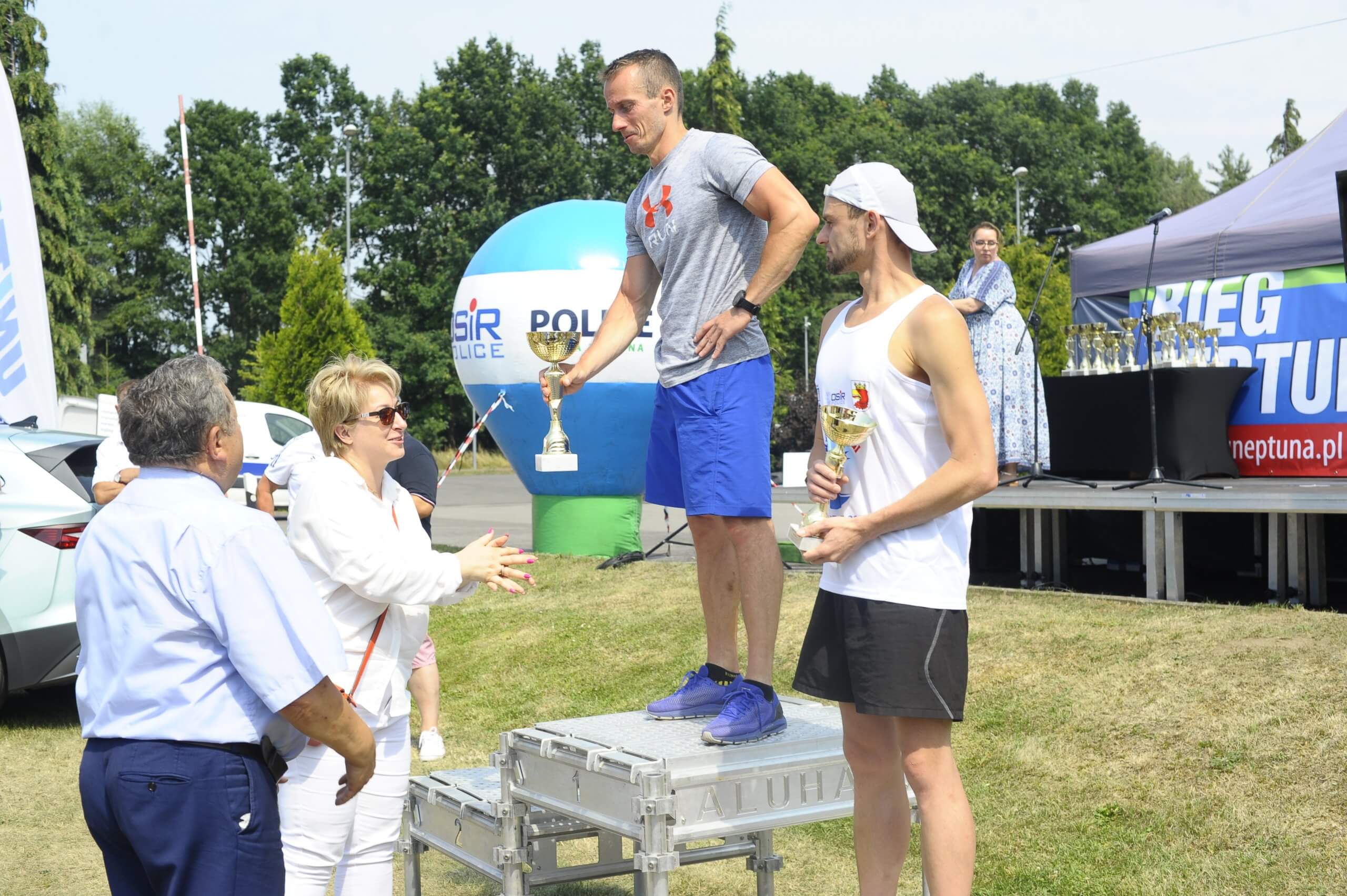 Wręczanie pucharów na Biegu Neptuna przez Joannę Napiwodzką Wicestarostę Polickiego, Dyrektora Ośrodka Sportu i Rekreacji w Policach Waldemara Echausta oraz Burmistrza Polic Władysława Diakuna