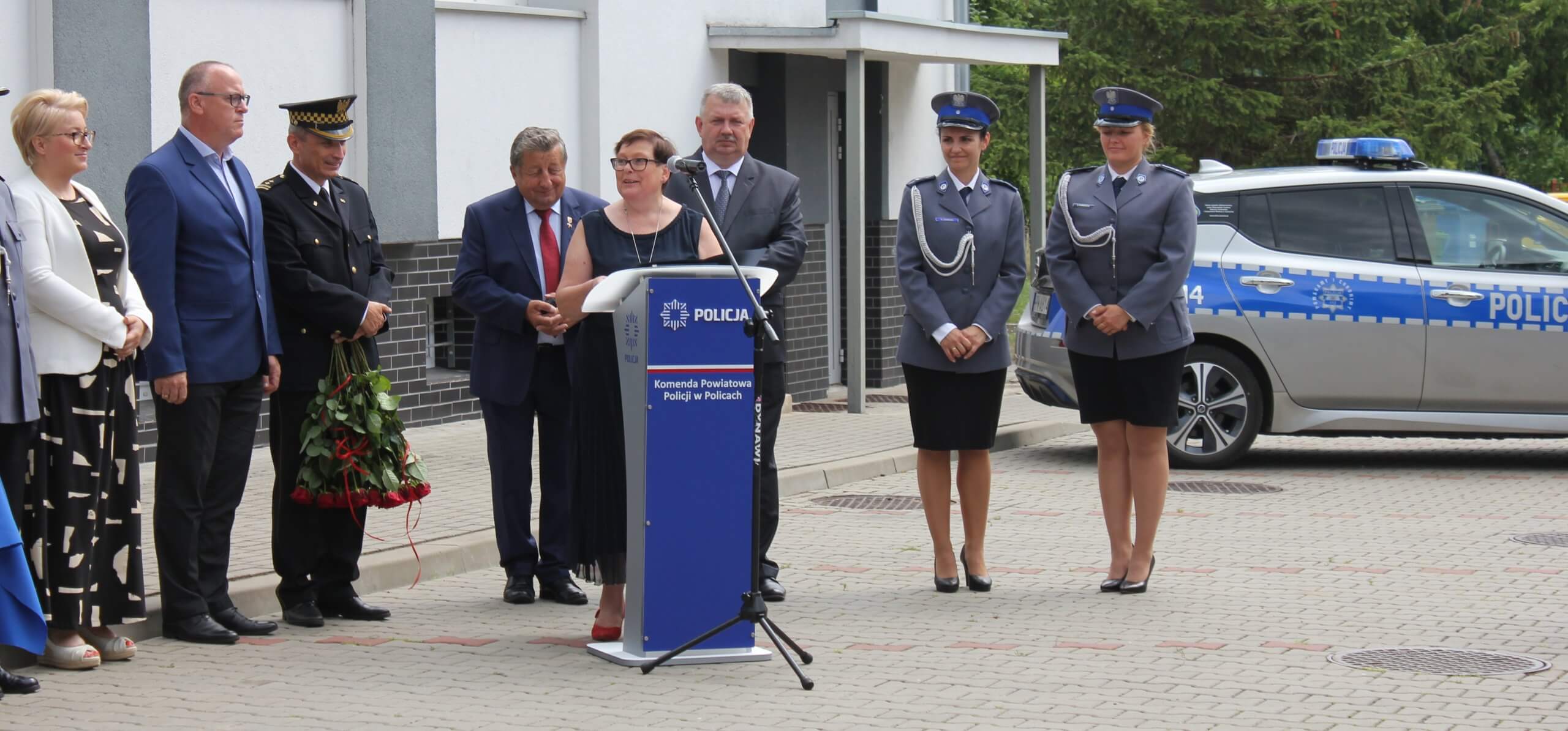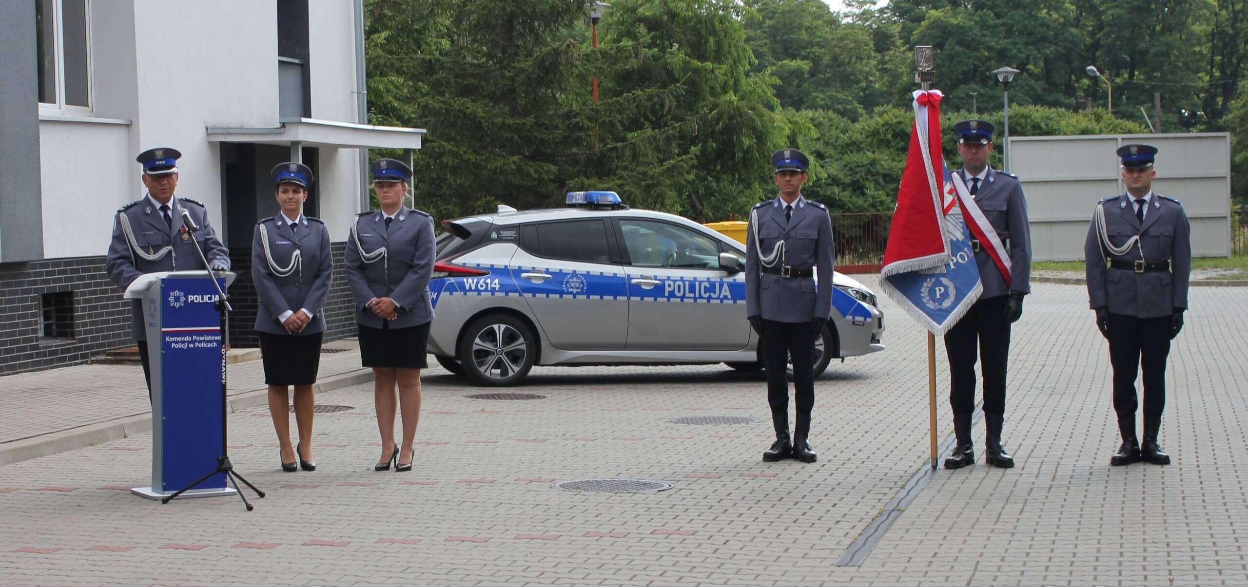 zdjęcie policjantów przy mównicy wraz ze sztandarem