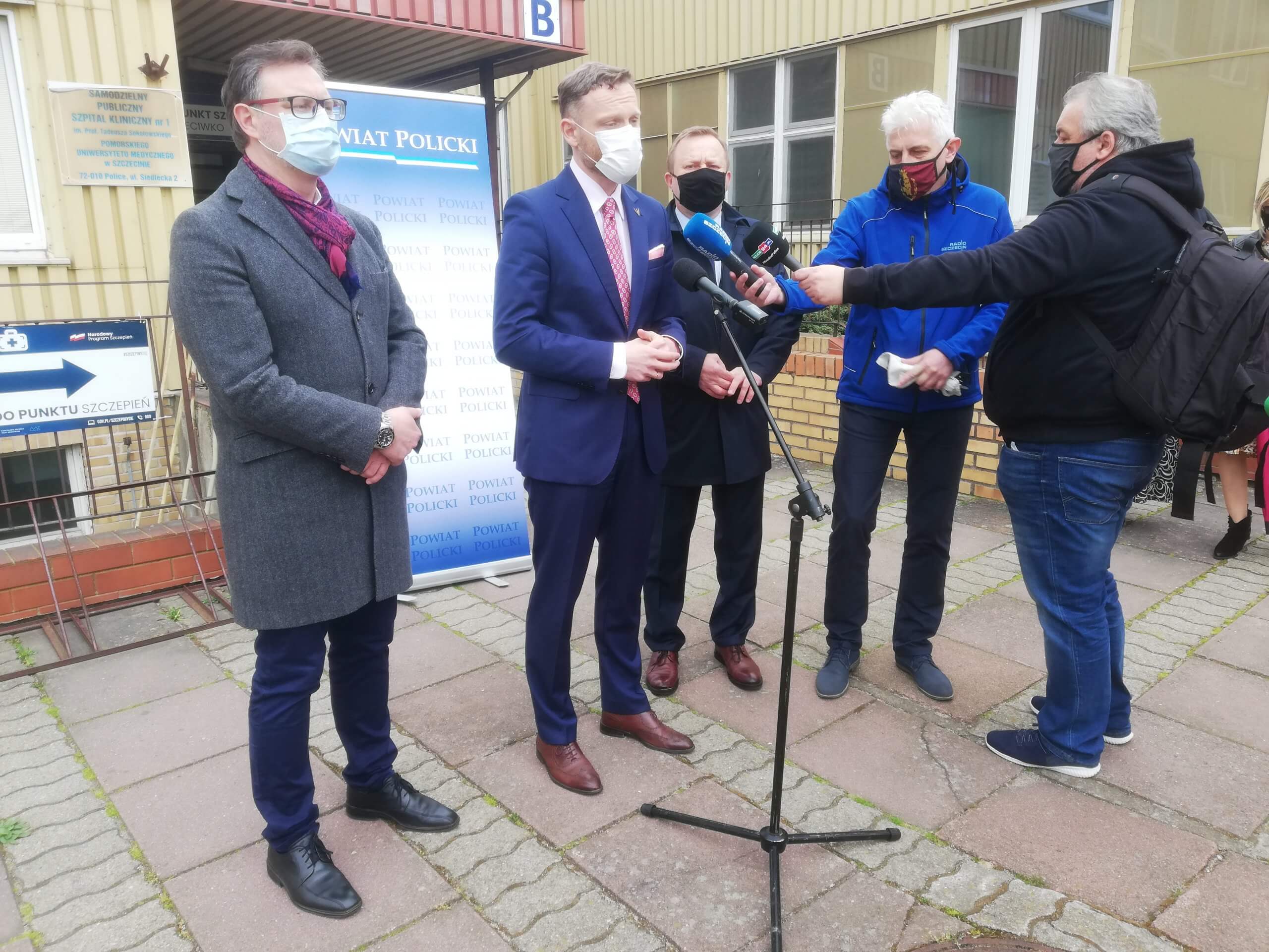 Starosta Policki Andrzej Bednarek, Wojewoda Zachodniopomorski Zbigniew Bogucki i Dyrektor szpitala Konrad Jarosz podczas briefingu prasowego