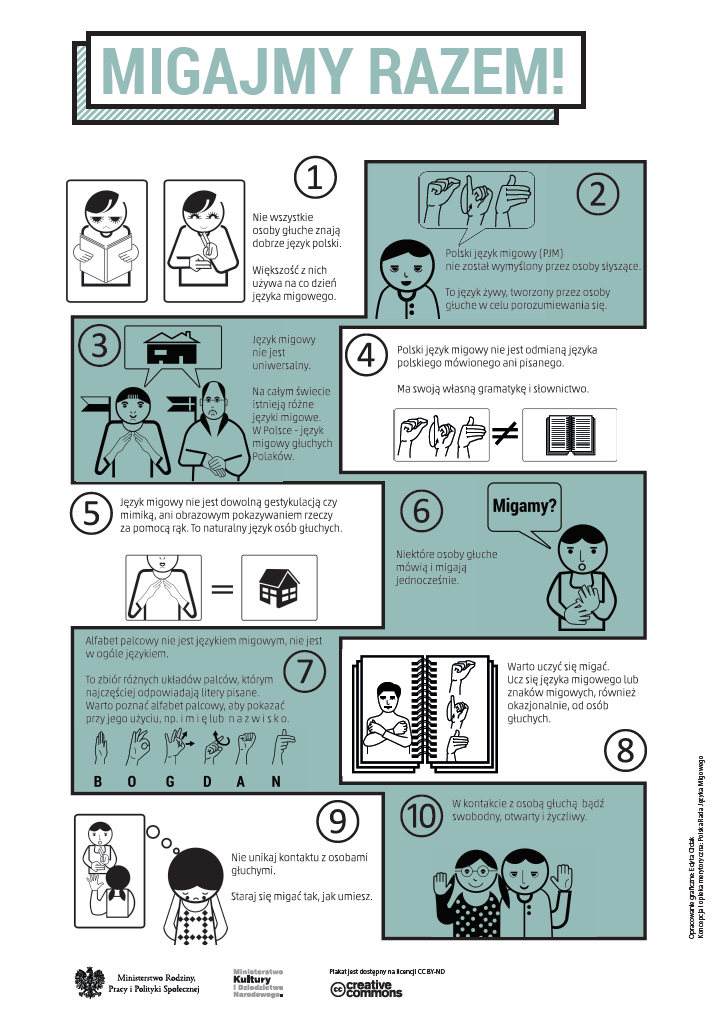Na prośbę Dyrektora Biura Pełnomocnika Rządu do Spraw Osób Niepełnosprawnych w Ministerstwie Rodziny, Pracy i Polityki Społecznej publikujemy plakat pt.: „Migajmy razem!” dotyczący stosowania Polskiego Języka Migowego, opracowany przez Polską Radę Języka Migowego powołaną na podstawie przepisów ustawy z dnia 19 sierpnia 2011 r. o języku migowym i innych środkach komunikowania się (Dz. U. z 2011 r. nr 209, poz. 1243 z późn. zm.).