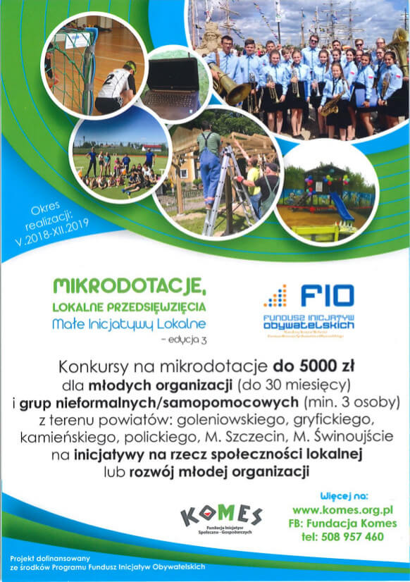 Fundacja Inicjatyw Społeczno-Gospodarczych KOMES zaprasza młode fundacje, stowarzyszenia, spółdzielnie socjalne i inne podmioty społeczne (działające do 30 miesięcy), grupy samopomocowe oraz grupy nieformalne do składania wniosków o mikrodotacje na kwotę do 5 tysięcy złotych w ramach projektu „MIKRODOTACJE, LOKALNE PRZEDSIĘWZIĘCIA Małe Inicjatywy Lokalne edycja 3”.