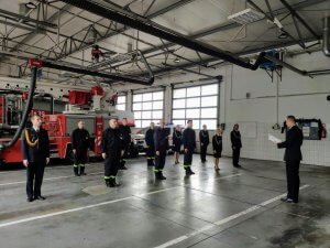 Komendant Powiatowy po krótkim podsumowaniu poprzedniego roku pracy, podziękował za dotychczasową służbę, w szczególny sposób akcentując widoczne zaangażowanie podległych strażaków w wielotygodniowe działania związane z ograniczaniem rozprzestrzeniania się koronawirusa SARS-Cov-2.