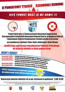Od 21 do 29 września Powiat Policki organizuje II Powiatowy Tydzień Czerwonej Krwinki. W każdej Gminie Powiatu Polickiego będzie można oddać krew. Dla każdej osoby, która to zrobi, organizatorzy przygotowali niespodzianki.