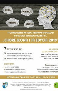 Osoba, która choruje na zaburzenia psychicznie często spotyka się ze słowami które ją ranią: „Wariat, debil, czub, psychol…”. Stowarzyszenie na Rzecz Harmonii Społecznej realizuje projekt pt. „Chore słowa i ja, edycja 2019”.