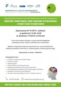 Stowarzyszenie na rzecz Harmonii Społecznej w Policach zaprasza do wzięcia udziału w obchodach Światowego Dnia Zdrowia Psychicznego.