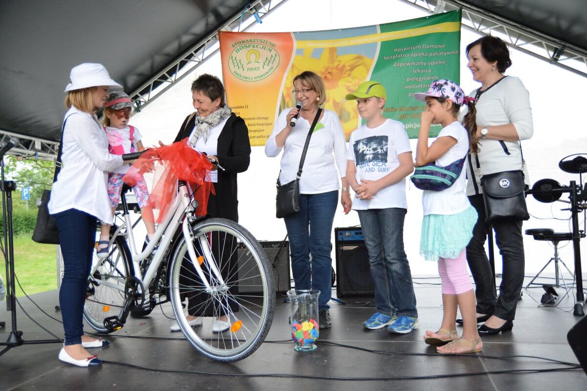 Aleksandra Mazur-Woroniecka Prezes Stowarzyszenia Hospicjum Królowej Apostołów w Policach oraz Beata Chmielewska Członek Zarządu Powiatu w Policach wręczyły szczęśliwym zwycięzcom główne nagrody wygrane w losowaniu - rower i tablet.