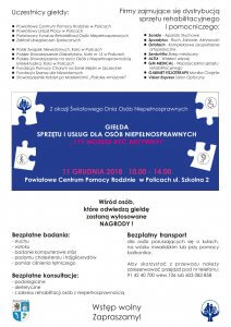 11 grudnia z okazji Światowego Dnia Osób Niepełnosprawnych w siedzibie Powiatowego Centrum Pomocy Rodzinie, przy ul. Szkolnej 2, w godzinach 10:00 – 14:00 będzie można zapoznać się z szeroką ofertą giełdy – obejrzeć wystawę sprzętu rehabilitacyjnego, zbadać poziom cholesterolu i trójglicerydów, dokonać pomiaru ciśnienia tętniczego.
