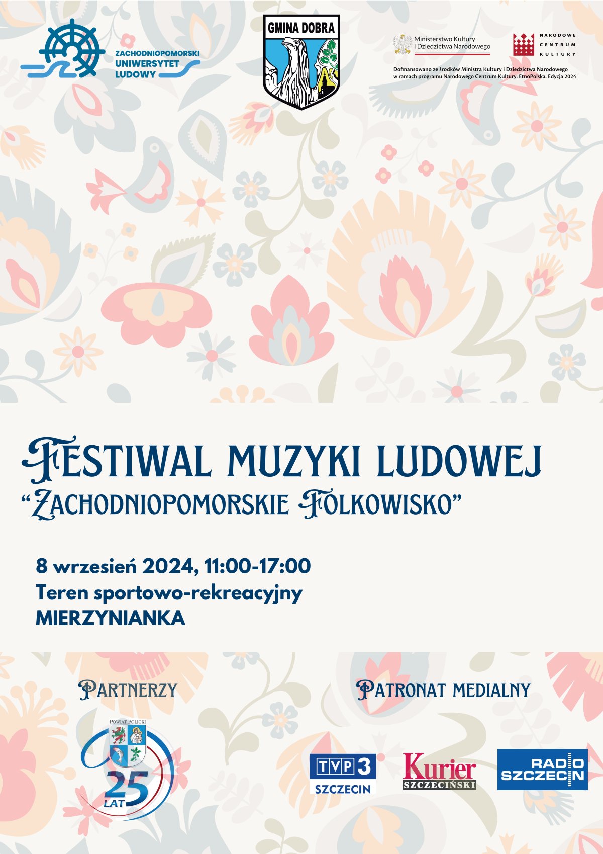 Zachodniopomorski Uniwersytet Ludowy serdecznie zaprasza na Plenerowy Festiwal Muzyki Ludowej "Zachodniopomorskie Folkowisko", który odbędzie się 8 września 2024 roku na terenie sportowo-rekreacyjnym "Mierzynianka" przy ul. Nasiennej 20 w Mierzynie.